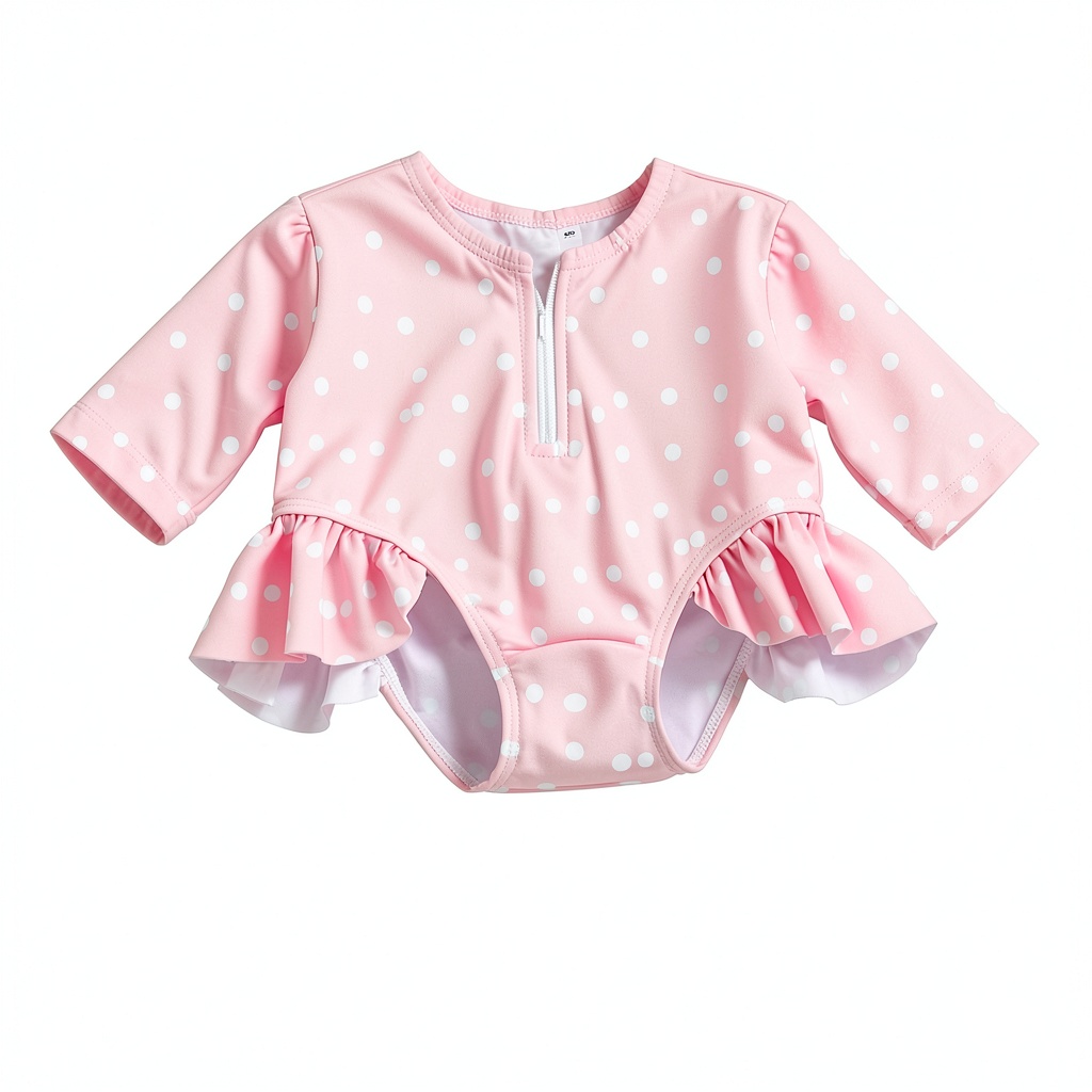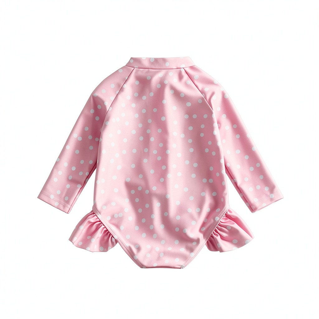 This baby girl swimsuit offers sun protection with its long sleeves and is crafted from soft, durable materials for comfort. Ideal for beach outings and pool play, it includes easy snap closures and a charming dot design with ruffled accents. Available in multiple sizes and colors to suit your toddler’s needs.